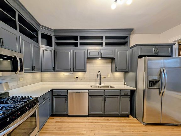 Welcome to your inviting home in the serene Bridgeport neighborhood, tucked away on a quiet cul-de-sac. This dog-friendly, duplex down features 3 bedrooms, 2 bathrooms, a detached garage, an enclosed porch, free shared laundry, and a large backyard-an ideal blend of comfort and convenience. Inside the foyer, a private coat closet is reserved exclusively for this unit. The main level boasts hardwood floors, fresh paint, and abundant natural light streaming through front and rear windows. Relax in the living room, or retreat to two comfortable bedrooms and a fully updated bathroom with a reglazed tub. The modern kitchen is a standout, with custom cabinetry, white quartz countertops, porcelain subway tile backsplash, and newer stainless steel appliances-perfect for cooking and entertaining. The spacious enclosed porch off the kitchen provides extra room for storage or casual use. The lower level adds flexibility with a generous family/recreation room, built-in wet bar, second full bathroom, and a third bedroom that can serve as an office, guest room, or extra storage. This space can also be converted into a private primary suite. Free shared laundry in a common area easily accessible from the unit. The large backyard is perfect for outdoor gatherings, relaxing in the sun, or letting your dog play freely. The neighborhood has a park at the end of the block, and is close to the Bridgeport Art Center, Marz Brewery, Ramova Theatre, Mariano's, Target, White Sox Stadium, Chinatown, and a variety of restaurants and shops. Transit is convenient, with access to CTA Red, Orange, and Green Line stations, as well as a nearby Metra station. Quick access to I-290, I-90/94, I-55, Lake Shore Drive, and downtown Chicago makes commuting easy. Rent includes lawn care, snow removal, water/sewer, and trash. Tenants are responsible for gas and electricity. One garage parking space available for rent at an additional $100/month, with non-permitted street parking in front. This home blends comfort, style, and convenience-schedule a showing today!