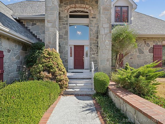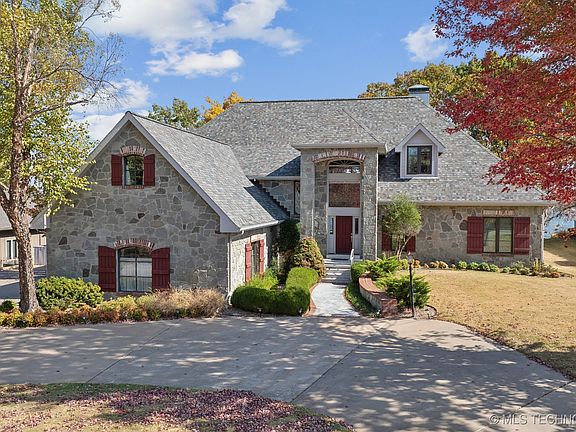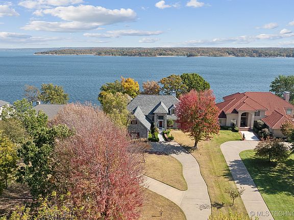 Custom 5 bedroom waterfront home on bluff with million dollar views. Large lot with greenbelt, great street appeal and long circle drive. Open floor plan with views of the lake at every turn. Oversize kitchen with island and many built-ins. Massive primary suite w/over-sized closet, dressing and extended bath area. Guest wing w/2 bedrooms, one opening to indoor hot tub. Upper level includes media/game room, wet bar, second game room, and 2 ensuite additional bedrooms. The home was built by Tulsa Builder Don Kirberger and includes to many options to mention. Furniture, furnishings and golf-cart negotiable. Must see to appreciated.