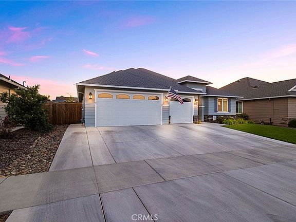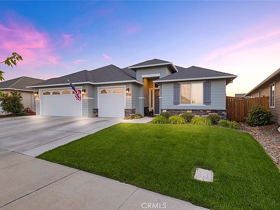 Fantastic 2019 Epick built home in the Sycamore Creek Subdivision. This 2,204 sq. ft. 4 bedroom, 3 bath home with SALT WATER POOL and OWNED SOLAR is ready for a new owner. Wonderful North Chico neighborhood near Wildwood Park & Upper Bidwell park. This home is located near shopping centers, restaurants, Pleasant Valley High School, Marigold Elementary School, and Bidwell Junior High School. Pride in ownership best describes this neighborhood. Nice bike and walking trails to enjoy the outside and views of the reserve and surrounding foothills. The fully landscaped front yard with extra wide driveway and formal 11ft, high covered porch will welcome you and your guests into the home. Highly desirable open floor plan offers luxury vinyl plank flooring in the entry, dining room, living room, kitchen and hallways. On one side of the home you have two guest bedrooms with a guest bath offering granite vanity, 24"X24" tiled floor and tub/shower combination. The dining room has 9 ft. ceilings with a 10 ft. coffer inset with recessed lighting. The kitchen overlooks the living room with a gas fireplace wrapped in a wood mantle and hearth! The kitchen offers granite countertops, pantry cabinet, stainless appliances, stainless steel undermount sink and a 8ft. X 5ft. center island/ breakfast bar. On the other side of the home is the 3rd guest bedroom with the 2nd bath offering 24"X24" tiled floor, granite vanity and a step in tiled shower. The spacious primary suite measures 235 sq. ft. with a 10 ft. coffered ceiling, recessed lighting, ceiling fan/light, 10'X6' walk in closet and private door to the covered back patio. The primary bath offers 12"X24" plank tile flooring, dual sink granite vanity, separate toilet room and huge walk in tiled shower! The backyard is wonderful for entertaining. The 2019 Salt Water pool has concrete decking surrounding, a total of 382 square feet of covered patio, concrete walkway to the front yard and irrigation for potted plants line the outside of the pool deck. Definitely a great entertaining area. The solar tru-up averages 600.00 per year. Call your favorite agent today for a tour!