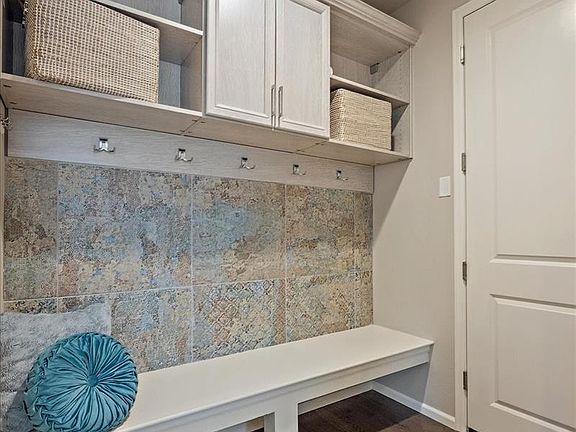 Inside, the mudroom features a built-in bench and access to an oversized garage. Rich wood flooring flows through the main level, connecting the spacious great room—wired for surround sound—to the upgraded kitchen and dining area.