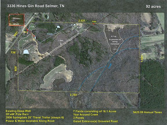 Attractive 91 acre hunting farm in West TN has paved road frontage on Hines Gin Rd, a 28 foot camper with 20x48 storage/cover, access to municipal water & electricity, and beautiful location for potential new construction of your home. The forested area is a mixture of pine and young hardwood that has NOT been recently cut and is a fantastic deer and turkey habitat. The location of this prime hunting acreage is within 11 miles of Hornsby, TN in Hardeman Co. and 7 miles from Selmer in McNairy Co. It has everything an avid hunter is looking for, prime location, abundance of wildlife, living quarters already in place, and great place to store and/or ride your ATV. McNairy County is in the heart of West Tennessee with easy access to Highway 45 and Highway 64. It is a convenient drive to Memphis, and Jackson Tennessee and also Corinth Mississippi. The Tennessee River and Pickwick Lake are also nearby for fishing and boating enthusiasts.