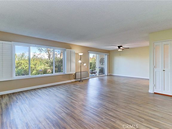 Wonderful location + view! 2BD/2BA first floor, east facing "Sierra" condo - enjoy the sunrise and mountain views from this elevated blufftop location. Great location between Clubhouses 5 and 6 - enjoy pools, small gym, game rooms, billiards and the many social activities that happen at Clubhouse 5. Walk right in and notice the vinyl plank floors and upgraded baseboards throughout leading to the spacious living/dining area with a vintage wet bar and great view. Dual pane windows/sliders (most with plantation shutters) frame the beautiful outlook and smooth ceilings give a modern feel. Kitchen features granite counters, stainless sink and microwave. Bedrooms are on the west facing side to receive the afternoon sun with good sized closets. Guest bathroom houses tub/shower combo and Corian-topped vanity while the primary bath boasts long, matching dual sink vanity area and walk-in shower behind the privacy door. Close to community laundry area and carport. Clubhouse 5 features a lap swimming pool with a gorgeous view and aquatic classes, hot pool, small drop-in fitness center, fitness studio and game room. Events are held at the large main lounge with stage and dance floor. Clubhouse 6 has a smaller pool open during the summertime and hosts many private parties and groups. Laguna Woods Village residents enjoy a 27-hole championship golf course, a 9-hole executive par 3 course, pickleball and tennis courts, lawn bowling, gyms, clubhouses, swimming pools, horse stables, gardening centers, artist studios, computer workrooms and classes + over 200 clubs and organizations.
