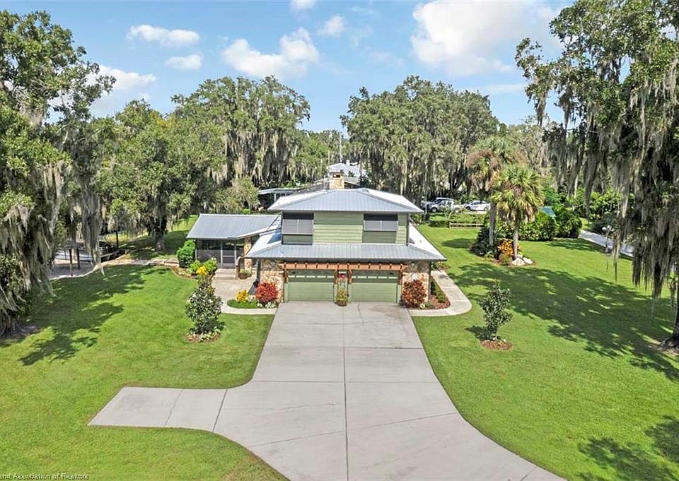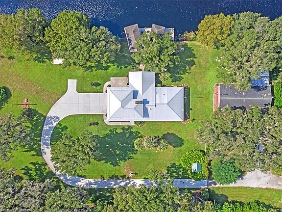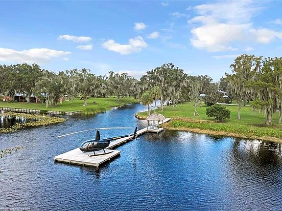 I'll bet you have never seen TURNKEY like this! Starting with the 1.38 acre location at the end of a private road on the point surrounded by a canal and the 5th largest fishing lake in Florida. Concrete driveway leads you past beautiful landscaping to the main entry with open front porch with a composite deck perfect for animal and bird watching. Walk in to an enormous open concept living, dining and kitchen area ready to accommodate any large family gathering. Living room includes exposed wood beams on ceiling and a massive rock wood burning fireplace for those cozy gatherings on cool nights. Overnight guest are not a problem with the 4 beautiful and roomy en suites, 2 downstairs and 2 upstairs. Master and third bedroom have sitting rooms. Each room is tastefully decorated with high end furnishings, window treatments, artwork, and lots of decorative touches to remind you of the lake. Glass sliders lead to the screened back lani overlooking the canal and covered docks complete with rocking chairs and picnic table great for viewing sunsets. Lani is fully furnished with comfortable cushion furniture as well as decorated to match the lake feel. Of course turnkey includes a fully equipped kitchen, all linens for bedrooms and baths, and lots and lots of extras. 2+ car garage with extra fridge and built in cabinets as well like new washer and dryer. Also included 2 A/C units, 2 hot water heaters, 2 wells and newly updated irrigation and pump. Garage doors open to the lake view. Home faces 50 wooded private acres abounding with deer, turkey and many birds. It gets better as also included is a detached beautiful caged heated pool and spa including pool toys overlooking the lake. 138 ft.dock to lake includes a chickee over the water to watch the sunsets and a built in helipad for your copter. Included also your own concrete boat ramp for easy boat entry or exit. 30x25 covered patio areas over the water include a 24x11 boat slip with room for second. Independent uncovered docks on canal are 13x13 and original to home is 24x4 to accommodate boat parking. 280 gal fuel tank to take the stress out of boat or vehicle refills. Clean your catch at the detached workshop with attached lighted fish cleaning station. Newly painted exterior Cypress wood siding with exterior natural stone and rustic wood accents add to the character and charm of this spacious home. Property is equipped with bulkhead covering water exposed land. Many grandfather Oaks, newly planted Oaks, Cypress trees and Magnolias along with numerous shrubs and flowering plants add to the wow factor of the property. And last and finishing touch of the turnkey status has to be the 2016 24 ft. like new pontoon boat equipped with a 200 HP Evinrude motor is sitting in the boathouse ready for cruising or fishing. Call for an appointment and prepare yourself to be amazed.