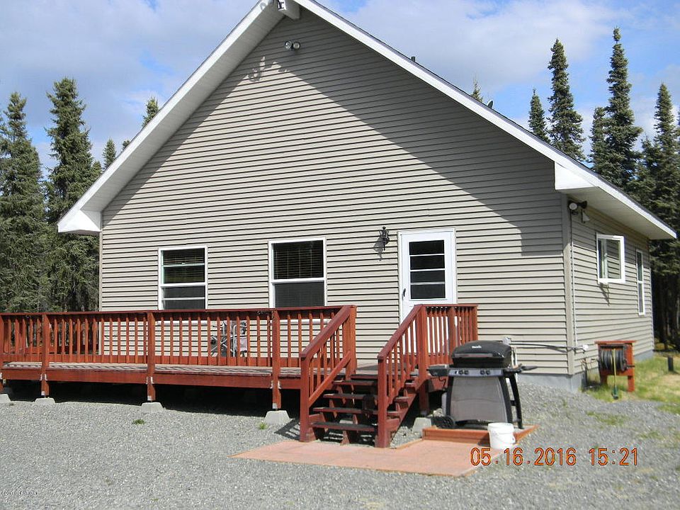 As new, seldom used ranch home KENAI RIVER ACCESS. Upper loft bedroom and 2 bedrooms on main level. 2.21 acres with 28'X36' gravel pad ready for garage or shop with power, water & septic to it. Parking area for RV and 2 large storage bldgs. Also features a large open kitchen & living area, large deck and above average quality construction.