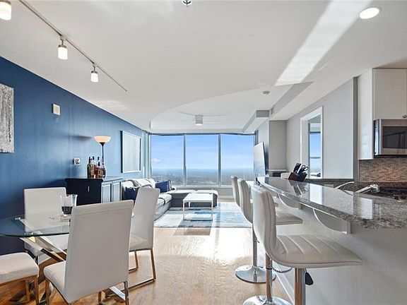 Beautifully updated with incredible views, this 1 bed +  sunroom/office + storage unit is a one-of-a-kind condo in sought after Buckhead Grand. You can see for miles as this condo sits high above any other buildings. Updated Kitchen with white cabinets, tile backsplash, under cabinet lights, update light fixture, granite counters, stainless steel appliances, breakfast bar, and views to the living room. Separate dining area with updated light fixture. Living Room with hardwoods and floor to ceiling windows keeps the condo light and bright while providing awesome views. Lovely Bedroom with hardwoods and two closets with custom organizers. Separate bonus room/home office makes this condo unique! Nest thermostat and washer/dryer stays. The 5 star amenities include 24 hr. concierge, pool, fitness center, spa services, gym, wine cellar, sky lounge, guest suite, pet walk & more! Great location near major roads, access bridge to Marta, close to restaurants and shopping, bike trails, & so much more!