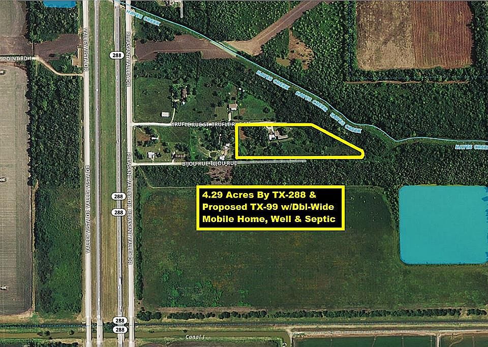 4.29 Acres By TX-288 & Proposed TX-99 w/1999 Skirted 1120 sqft Dbl-Wide Home, Well, Septic & Storage Buildings. TX-99/Grand Pkwy/Houston's 3rd Loop will span 180+ miles from League City-Rosharon-Katy-Tomball-Baytown (See Maps)! Minutes to TX-288 & TX-35 provide easy commute to Hobby Airport, Texas Medical Center & Houston only 25 miles away. 30 Miles to Lake Jackson, Freeport Plants & NASA/Johnson Space Center. 40 Miles to Texas City Refineries. Do Not Disturb Occupants. Guard Dogs in the Yard.