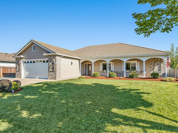 Very desirable location in Alder Creek Subdivision in East Medford close to Medical, Restaurants & Shopping. This home has NO steps, wide doors & wide a hallway. Large covered front porch that is south facing. Beautiful hardwood floors in the entry living rm, dining rm & bedrooms. High ceilings, crown molding & lots of pocket doors. Tile floors in the lg pantry/office/flex rm and all of the bathrooms. Open kitchen with lg island, stainless steel appliances, gas range & newly painted cabinets. Door to covered back patio with garden arear & storage shed. Primary bedroom is large with picture window, 2 ceiling fans, door to backyard, lg walk in closet, bathroom w/built in vanity & step in marble shower w/seat. Lg laundry rm, washer/dryer included, deep sink & storage cabinets. 2 car garage with built in storage cabinets, sink, work bench & finished epoxy flooring. Small RV parking! Tile roof, newer HVAC, newer ducting.