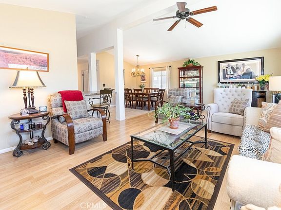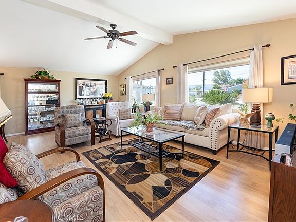 Come see this beautiful two-bedroom, two-bath home in the Tri Palm Estates & Country Club community. This home features an open floorplan with laminate wood-type flooring, bright and airy kitchen with newer countertops, cabinets, and a glass pantry door. The primary bedroom has beautiful double doors that open to the cozy back patio with a majestic mountain view. The home is fenced with white custom iron. The community offers many amenities. Large clubhouse, two big pools, lighted tennis courts, shuffleboard courts, and a restaurant.
