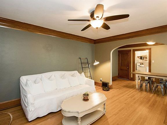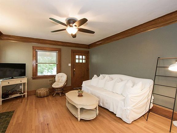 Why rent when you can own this charming home in a great neighborhood with updates galore The character is endless in this sun-filled home offering beautiful crown molding, natural woodwork and hardwood flooring. Features include a spacious living room, casual & formal dining, 2 bedrooms and 1 updated bath with plenty of room to expand. Enjoy summer on the large front porch or relaxing in the back yard. Top it off with vinyl siding and a detached two-stall garage. Call today for a private showing