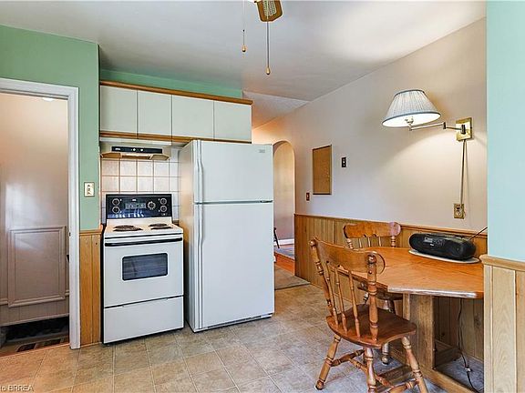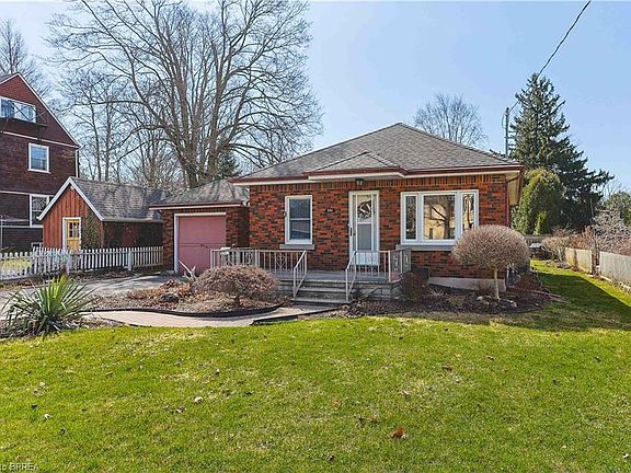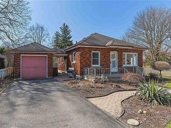 Welcome home to this adorable, well-cared-for brick bungalow, offering a perfect blend of charm and everyday convenience. Nestled on a large in-town lot, this home is surrounded by beautifully maintained garden beds, a separate vegetable and fruit garden, and a covered porch area in the backyard—an ideal spot to enjoy your morning coffee or unwind in the evening. Step inside where you'll find original hardwood flooring throughout, adding warmth and character to the space. The bright and inviting living room flows into a formal dining room, perfect for hosting family dinners and get-togethers. The eat-in kitchen provides ample space for meal prep, with room to enjoy casual dining. The main floor is complete with two spacious bedrooms and a full 4-piece bathroom. Downstairs, the large finished basement offers more living space, complete with newer carpet, pot lights, and a cozy gas fireplace with a brick surround. The basement also includes a versatile craft room, which could easily be converted into a third bedroom, along with a convenient half bath. Outside, the detached garage with hydro provides plenty of room for a vehicle, storage, or even a workshop. There's also a shed for extra storage, making it easy to keep outdoor tools and equipment organized. This home has been lovingly maintained and is move-in ready—a perfect opportunity for first-time home buyers or those looking to downsize while still enjoying outdoor space and a well-cared-for home. Nestled in a quiet and friendly neighbourhood, located close to parks, schools, essential amenities, shopping and easy access to public transit and Highway 401, don't miss your chance to own this charming bungalow in a great location!