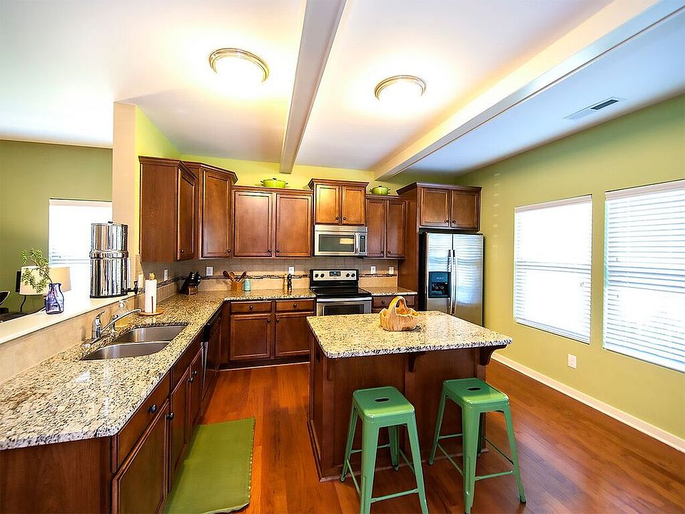 Adorable end unit located within desirable Harpers Green. Gated community located minutes from Lake Wylie with low SC taxes & Clover schools! Upgrades including hardwoods on main, spacious great room, study with French doors, dining room & a stunning kitchen w granite, tile backsplash & island with seating for 2. The owner's suite features a granite dual vanity, large shower, walkin closet & ceiling fan. Spacious secondary bedrooms & loft space plus full bath with granite counter. Private yard backing! Minutes from new Y, shopping & more. Don't miss this beautiful home!