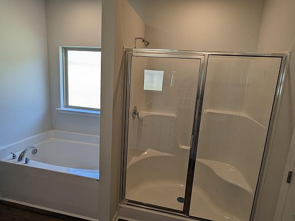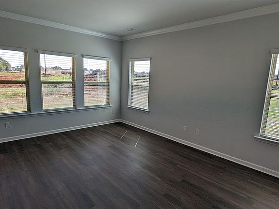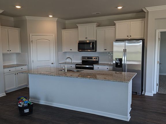Move in ready. The Robinson plan. This open floor plan creates a feeling of spaciousness without sacrificing coziness. The large kitchen is open to the family room and is equipped with an extra-large island, granite counter tops, refrigerator, pantry and tile backsplash. Large main suite offers double vanity with quartz tops, separate 5 foot garden tub, 5 foot shower with glass door and oversized walk-in closet. LVP flooring throughout the main living areas, bathrooms and laundry room with carpet in the bedrooms. 2 Inch white blinds included throughout. Enjoy the corner covered back patio all on a .28 acre lot.