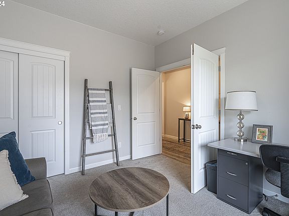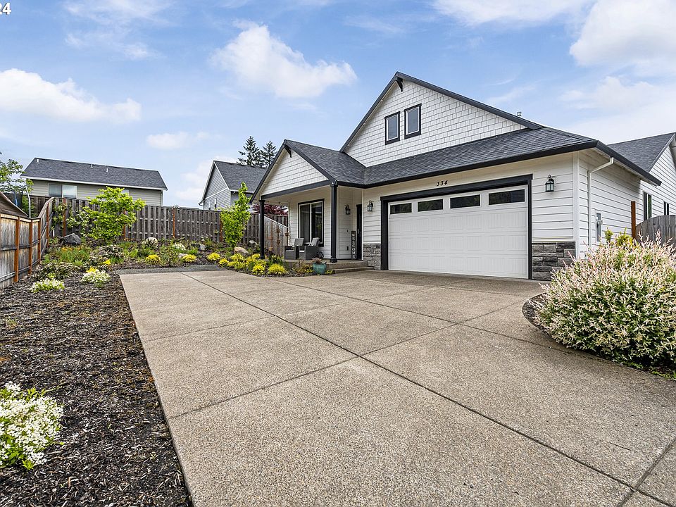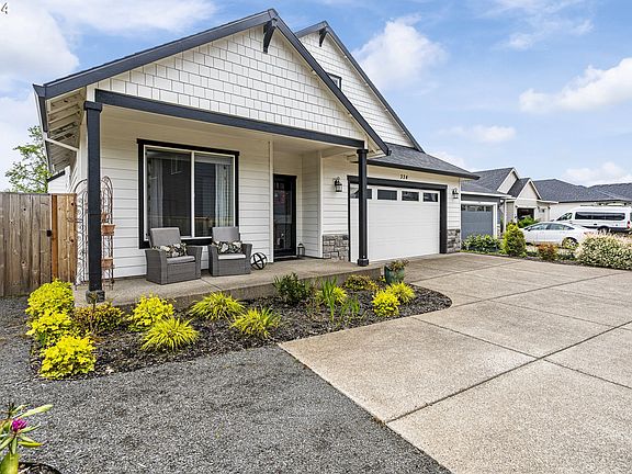 OPEN HOUSE TODAY IS CANCELED. Finished in 2019 by a local builder, this single-level home sits on a private flag lot within the Dutchman Ridge neighborhood near Chehalem Valley Middle School and Antonia Crater Elementary. This 1,756 sf. home boasts an open concept in the main living area comprising the living room, dining room, and kitchen. You will enjoy a gas fireplace and vaulted ceilings in the living room. The kitchen has quartz countertops, a stainless steel appliance package, and a sizeable pantry. The primary bedroom is spacious, with a walk-in closet (with organizers), tray/recessed ceilings, and an airy bathroom with a walk-in tile shower and separate water closet. This home also has a dedicated laundry room, extra space in the two-car garage, and a fourth bedroom near the entry (which would be great for a home office). Outside, you will enjoy a covered patio with an additional paver patio overlooking the professionally designed landscape. The backyard has a large grass yard, raised garden beds with drip irrigation, and thoughtfully designed shrubbery throughout. A walking path leads from the back, through the side yard, and to the front, where you will enjoy a large parking area.