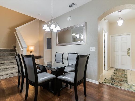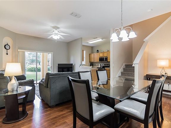LOCATION, LOCATION, LOCATION! It doesn't get much closer to the clubhouse amenities than this!!! Location is imperative for a successful short term rental in Regal Palms. This well cared for 3 bed/3 bath comes fully furnished, ready for your guests. Guest on-suite bedroom downstairs, 2 master bedroom suites upstairs. This home is spacious with open living space and an updated kitchen - ALL NEW stainless steel appliances installed February, 2018! Relax on the patio off the living area... enjoy the outdoors & Florida sunshine. Beautiful laminate wood floors throughout the first floor. All fees paid to date, NO REACTIVATION FEES in this community since 2017. Regal Palms Resort is one of the most popular in the Disney vacation area or Orlando and Central Florida. Regal Palms is ~15-20 minutes to Disney property with amenities like: Two swimming pools at the clubhouse, one with slide, lazy river & zero point entry. There's a poolside tiki bar, sand volleyball courts, clubhouse with sports bar & restaurant, onsite reception, indoor & outside spa, fitness center with sauna & steam room, day spa & internet café. An indoor play zone similar to Chuck E Cheese with a terrific pirate theme. Full restaurant & bar. This 24 hour man-gated community has so much to offer & walking distance to grocery store (Publix), many restaurants, ice cream shop, bank, pharmacy, emergency clinic & more! Make an appointment to view today, this WILL NOT last long. All sizes are approximate, please measure for accuracy.