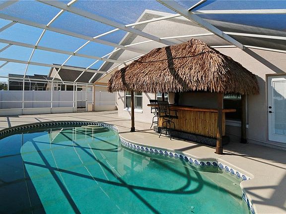 Live like you are on vacation or vacation with the luxuries of living! That is the lifestyle the new owner of this home will be enjoying. Starting with the exterior and the screen enclosed inground pool which sits on a higher elevation w/ gorgeous views of the sunrise. No direct rear neighbors, covered area, and yes- a custom built, one of a kind, full size Tiki Bar w/ power that will be the talk of the town. Interior features brand new, high end, vinyl flooring thru-out the entire downstairs. New carpet on stairs & in upstairs bedroom. Freshly painted interior, new double pane windows with the excepton of 3. New French Doors w/ built in blinds in dining room & huge vaulted ceilings. 5 bedrooms 4 full baths including master suite downstairs plus 2 additional junior suites (1 up and 1 down.) Open kitchen with an abundance of cabinets & counters. Dual zone HVAC w/ 2 programmable NEST thermostats. New roof in 2018. Garage wired for 240v perfect for an electric car plug & has additional outlets. Community features include tennis courts, playground & park. Location benefits include: 15 minutes to Disney, easy access to I4, SR429, SR 417, shopping, restaurants & much more!