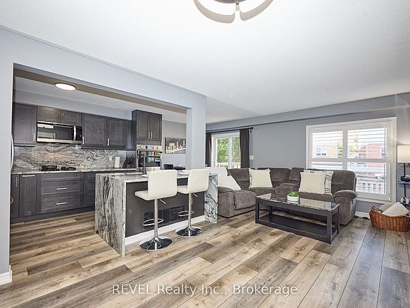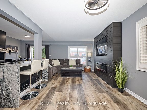 Beautifully Updated 2-Storey Townhome in Grimsby! Step into this stylish, move-in ready home where modern updates meet everyday convenience. The open-concept main floor is designed for both comfort and entertaining, featuring a spacious living room with custom feature wall encompassing a built in electric fireplace, and TV space. Main floor also features an eat-in kitchen with granite counters, a stunning waterfall island, custom built-in PITT gas stovetop, built-in range, and soft-close cabinetry. California shutters throughout add elegance, while sliding doors lead to a private, fully fenced yard with patio. Upstairs, retreat to a generous primary suite with an ensuite featuring a beautiful custom shower. Upstairs is complimented by two additional bedrooms, a 4-piece bath, and a convenient laundry area with tub. The finished basement extends your living space with a cozy family room and plenty of storage. Enjoy the practicality of an attached 1.5-car garage with a side-mount door opener and direct walkout to the backyard. The only shared wall is within the garage. No living spaces are attached, offering the privacy and comfort of a detached home. Every detail has been thoughtfully designed with high-end finishes, making this home an absolute must-see in Grimsby.