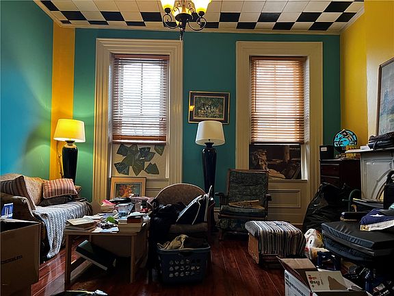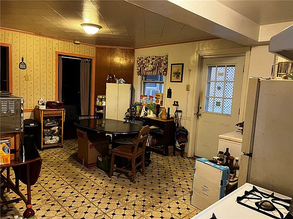 So many possibilities to redo this stately home with a detached 2 car garage and deck above the garage. newer furnace and updated electric. living room has 10 ft ceiling, many of the other rooms have lowered ceilings. There is a set of closed off steps in the kitchen to the second floor closed off by a closet that can be reopened. The basement is huge and opened that can be finished, it has a full bath and walk out to the yard and garage.