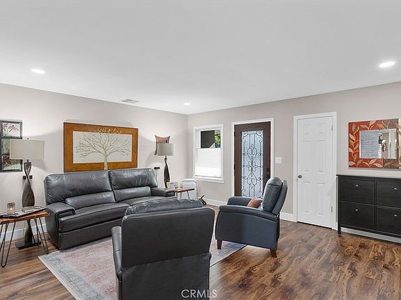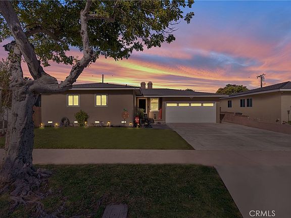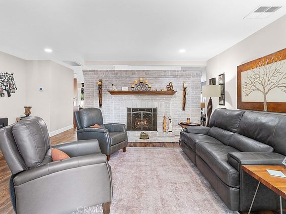 THIS SINGLE STORY "TURN KEY" CITY OF ORANGE GEM TRULY SPARKLES. This midcentury home has been expanded to 1793 square feet with 3 bedrooms, 2 bathrooms and is upgraded through out with bull nose corners and custom texture. Enter through the custom entry door, to the first of two living spaces w/ floor to ceiling white washed brick fireplace. Milgard Tuscany dual pane windows, recessed lighting, Spacious Den with 2nd floor to ceiling fireplace with white washed bricks. The beautiful open chef’s kitchen features updated quartz counters, gas stove, an integrated dishwasher an island with pendulum lights. There's lots of decorator cabinets and a wine/beverage cooler to keep your refreshments ready for entertaining. The dining area is adjacent to the den, here you can take in a movie or sit quietly and enjoy the fireplace. The Primary Bedroom is ensuite with a walk in closet. The bathrooms have been completely remodeled too! The oversized laundry room has NEW flooring, beautiful cabinets, a decorator sink & counter tops and it's own wine rack! Cheers! How about a covered patio with a Hot Springs Salt Water spa to relax in? The backyard is neatly landscaped with a lush lawn and fruit trees and is enclosed with block walls. There are also a large storage shed to help keep things in order. Inside the garage there are plenty of cabinets and a rubberized floor. Above the garage is a lofted storage area with a ladder access. Wooden gates were recently installed too. Soft water conditioner and tankless water heater. All of this is protected under a 2 year NEW ROOF! Come take a look, this is the one for you!