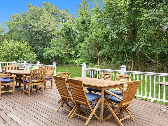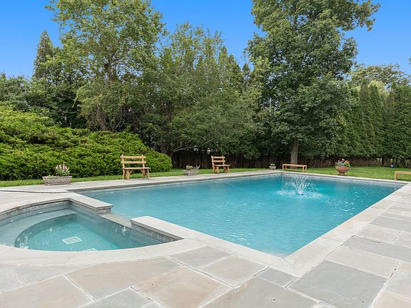 This five-bedroom, four and a half-bath home boasts a large living room with fireplace. Gourmet cooks will enjoy the kitchen with granite countertops, which opens onto a large deck for entertaining. The master bedroom has a gas fireplace, a wraparound deck, and a tumbled-marble master bath. The private pool area features a heated, gunite pool with spa, surrounded by a bluestone patio. The Jacuzzi looks out onto Noyac Harbor. Fully landscaped with plenty of space to play and entertain. Centrally located with easy access to Southampton, Sag Harbor or Bridgehampton towns.