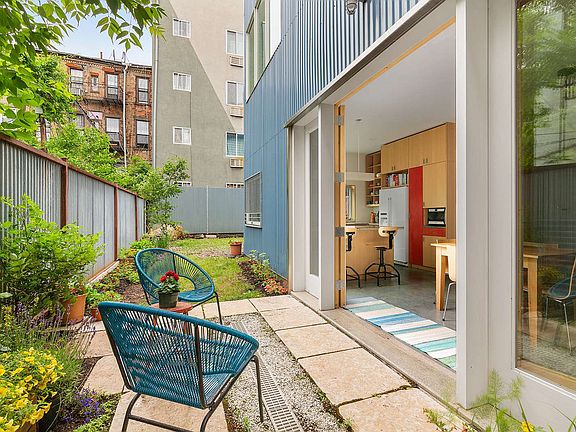 Better than a brownstone! This one-of-a-kind custom built single family home was beautifully crafted with the utmost attention to detail. This four story 4 bedroom 2.5 bathroom house was solidly built with thick walls and durable maintenance-free metal siding, creating an incredibly quiet living space. The entire home has high ceilings, radiant-heated poured concrete floors, and high-quality custom maple cabinetry and millwork. Additionally, there is a sprawling roof deck, a peaceful side garden, and TWO PARKING SPACES! Air-tight Marvin double-glazed casement windows and a fully-insulated structure keep out the elements and control sound, helping this home to be quiet and energy efficient. This house was designed with central AC and a top-of-the-line air filtration system. Enter through the custom steel gates to a private oasis. The garden level has an entry foyer with coat closets leading into a gracious living/dining room with 9’6” high ceilings. The great room opens directly onto the side garden by way of four floor-to-ceiling glass doors creating indoor/outdoor living making this home truly unique. The beautifully designed open kitchen with two large windows is both visually stunning and highly functional. There is a half bath on the garden level for added convenience. Ascend the architecturally striking wood and steel staircase to the second level featuring the massive corner master bedroom with built-in closets and a large bathroom. On this level you will also find a spacious office with built-in desk and cabinetry, and a separate walk-in laundry room with vented dryer. Up one more flight brings you to another level featuring two enormous bedrooms and a full bathroom. The top level opens onto the expansive roof deck with limitless potential. Additionally there is a finished basement with 9’6” high ceilings that could easily be used as a play room, home gym, recording studio, or large recreation room. This home is located in the hidden gem historic Wallabout section of Clinton Hill! Close to the Brooklyn Navy Yard and coming soon Wegmans grocery store, WeWork Building, and the sprawling Building 77 Food Hall. Enjoy the architecture, restaurants and amenities of Clinton Hill, along with the prized sculpture garden and academic culture of Pratt Institute. Public transportation options are G train and soon to come ferry service from the Brooklyn Navy Yard. This home is a MUST SEE MASTERPIECE!
