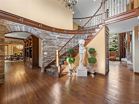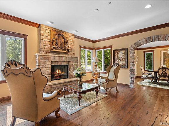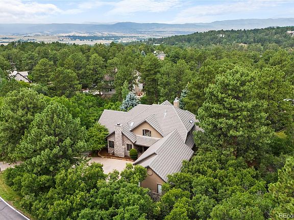 Exceptional property in the exclusive gated community of The Village at Castle Pines. Nestled among towering pine trees, this home offers an inviting outdoor living space with a flat yard perfect for enjoying Colorado's beautiful seasons. The mountain-inspired home is bright and airy, featuring numerous upgrades. The gourmet kitchen boasts a large island and offers warm fireplaces and scenic wooded views throughout. Dual primary suites on both the main and upper levels make it ideal for hosting guests or accommodating multi-generational living. The finished basement is an entertainer's dream, offering various recreation areas for hobbies and games, a wet bar, and an exercise room. Enjoy the serene wooded views from the large deck or the patio below, accessible via the walk-out basement. This property is filled with beautiful features, making it a perfect home for those seeking luxury and comfort in a picturesque setting.