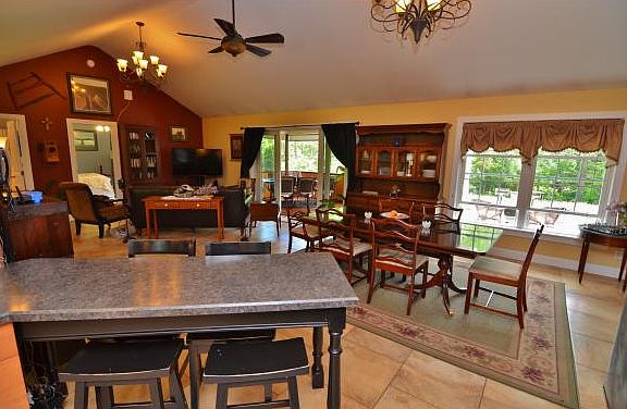 If you have been searching for a private yet convenient setting this is it! Open land, your own pond, over 1000' of water frontage on the Sugar River. This home shines like new. From the moment you walk across the covered farmers porch and enter the 2-story foyer, you know you have arrived at a truly special place. Enjoy an open floor plan with cathedral ceilings and tiled floor in living and dining rooms; both rooms open to the kitchen as well! The kitchen offers ample cabinetry, a breakfast island, black appliances and a tiled back splash. There are 3 bedrooms on the main level including a gracious master suite w/walk-in closet, tiled shower, two vanities & a soaker Jacuzzi tub! The 2nd floor offers a family room and bonus room. There is a 2-car heated garage w/built in shelving, radiant floor heating, an outdoor wood boiler, gorgeous screened in porch, patio area with hot tub, nice landscaping, two outbuildings, 5.5 acres of land, wired for a generator, school choice and much more.