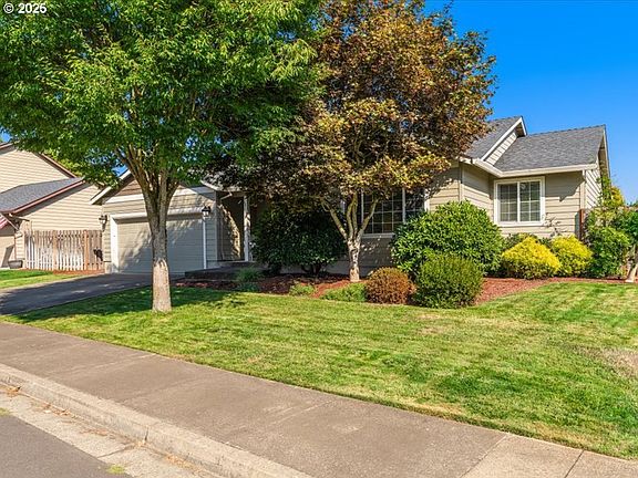 Welcome to this beautiful one-level home in Newberg! The sweetest front porch welcomes you. Inside you'll find a spacious great room with soaring vaulted ceilings. The great room is open to the dining room and updated kitchen. The kitchen has it all... a pantry, eat-at bar, quartz counters and overlooks the large backyard. The laundry room is perfectly located between the kitchen and the garage. Thoughtful upgrades throughout this home: quartz countertops in the kitchen and both bathrooms, newer hardwood flooring and carpet. The primary suite includes a walk-in closet and updated bathroom with tile shower & tile flooring. Enjoy the a/c in the summer and the gas furnace in the winter! This home is on a large lot and includes a wonderful, fully fenced backyard. From the extra large patio to the raised garden beds this backyard is ready for you! Welcome home!