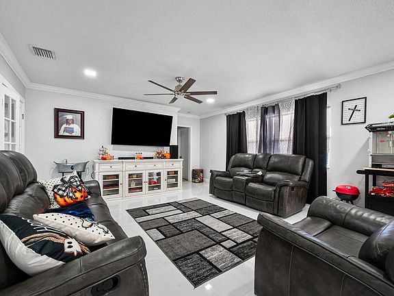 Stunning 6 BDR/4 BATH home offers modern design and functionality. Large polished ceramic tiles throughout. Custom-designed kitchen with sleek cabinetry. Granite countertops with elegant waterfall edge adding both style and functionality. Stainless steel appliances. The master suite is a true retreat, featuring a spa-like en-suite bathroom, dual sinks set into a granite vanity, walk-in shower enclosed with glass doors. Additional four bedrooms offering flexibility for guests, family members, or home office. The home's open floor plan flows naturally into the outdoor living spaces, with fenced backyard ensuring privacy and security. The covered patio offers the perfect spot for outdoor dining and relaxation, overlooking a sparkling in-ground pool surrounded by a durable concrete pool deck.