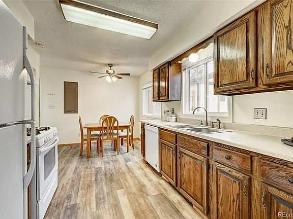 The adjacent kitchen is a chef's delight, featuring white appliances, ample cabinet space, and a cozy dining area where you can enjoy meals with loved ones. Just beyond, a door leads to the spacious backyard, offering endless opportunities for outdoor fun and relaxation.