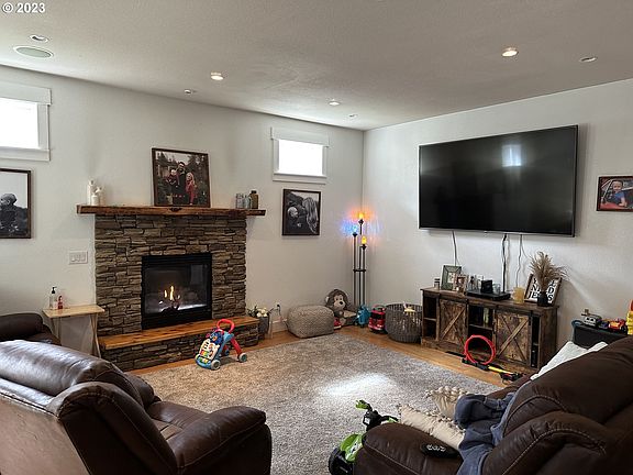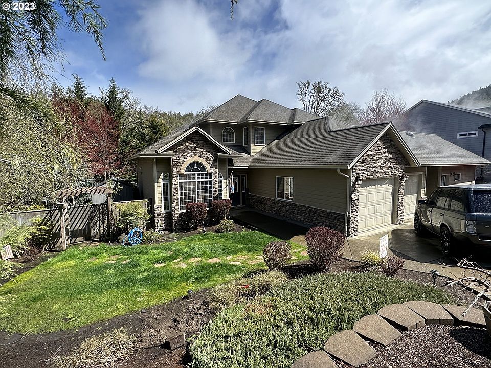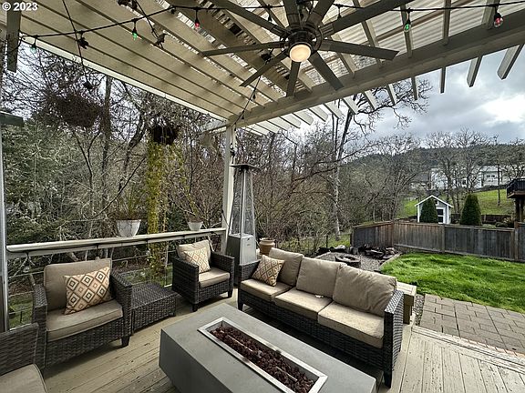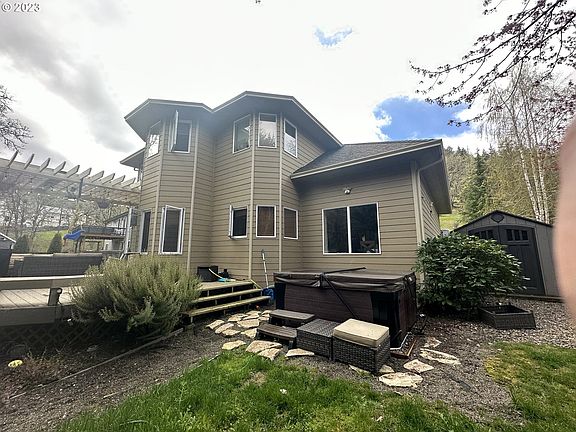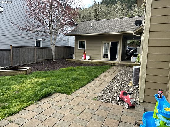 Fabulous custom home in lovely community of similar houses. Gourmet kitchen, granite counters, built in oven and microwave and a gas cook top. Breakfast nook plus a formal dining. Sunken living room with cozy gas fireplace and a beautiful view of the yard and creek. Family room has drop down projection screen, projector included as well as mounted TV's. Bamboo floors are so pretty as is the grand entry and stairway. One bedroom and half bath downstairs, 3 bedrooms, 2 baths upstairs. Room & full bath off of breezeway is being used as a guest room or additional living space and is permitted as an addition to an existing building. It has ductless heat pump and a full bath. Hot tub, covered porch for entertaining and large garage. Such a beautiful home and property. Open community space near this home.