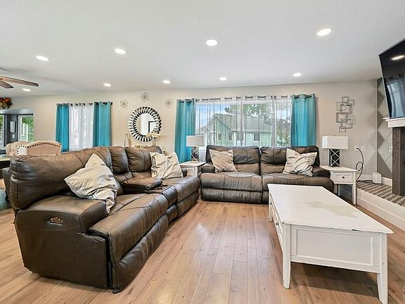 Beautiful home with 3-car garage featuring brick faade, wood siding, epoxy floors, shelving, and exterior service door. Plenty of parking and a composite shingle roof. Main level offers luxury vinyl plank flooring, wood-burning fireplace, and LED lighting. Kitchen/dining combo includes shaker cabinets, Formica counters, butcher block island, glass backsplash, stainless appliances, pantry, and walk-out to composite deck. Primary suite has vinyl plank floors, step-in and walk-in closets, ceiling fan, and a spa-style bath with dual vanity, tiled shower, tub, and water closet. Second bedroom with ceiling fan, vinyl plank flooring, and step-in closet. Full hall bath with tile and custom shower surround. Lower level includes a large family room with fireplace and walk-out, half kitchen with shaker cabinets and tile flooring, and spacious laundry with storage and folding counter. Three additional bedrooms—two carpeted, one with vinyl plank—all with closets and LED lighting. Stylish bath and bonus storage area. Fully fenced backyard, ready to enjoy!