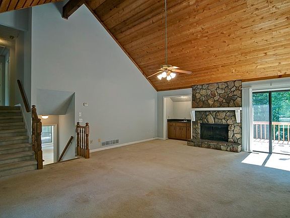 THE DRAMA OF WOOD! Wood and beamed vaulted ceiling, wet bar and fireplace accentuate the spacious great room. A step saver kitchen has gleaming hardwood floors, solid surface counters, sunny breakfast area with trey ceiling and stylish medallion. Separate dining room with lovely hardwood floors for the joys of good food and friends. The extra large family room on the lower level is perfect for party, playing, or relaxing. Full bedroom and bath on the lower level. Lots of backyard space for entertaining or gardening. Interior of the home is freshly painted.