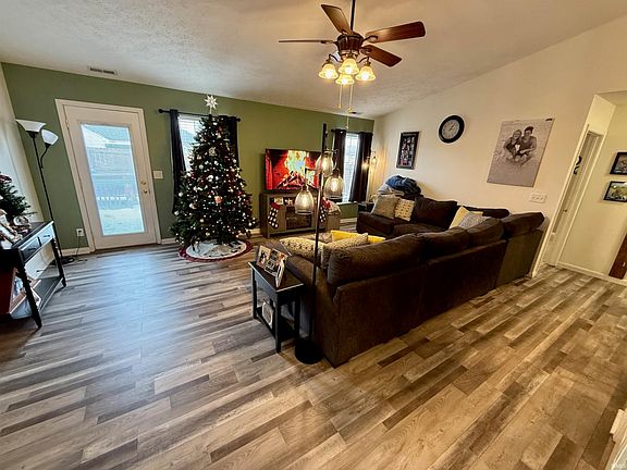 Nestled in a quiet cul-de-sac, this inviting 3-bedroom, 2-bathroom home offers a spacious open floor plan with cathedral ceiling. The living room features updated vinyl plank flooring, creating a modern and low-maintenance space. The kitchen boasts painted cabinetry, tiled floors, and a cozy dining area for family meals. Step outside to a private backyard oasis with a large deck, patio space, and a fenced-in yard-perfect for entertaining or relaxation. An above-ground pool invites you to cool off during the warmer months, and the outbuilding offers additional storage or workspace. Conveniently located near the community pond, this home combines comfort, functionality, and a peaceful setting. Attached 2 car garage features epoxy floors. Updates per seller: Roof (2020), New Pool Liner, All New Ceiling Fans, Vinyl Plank Flooring.