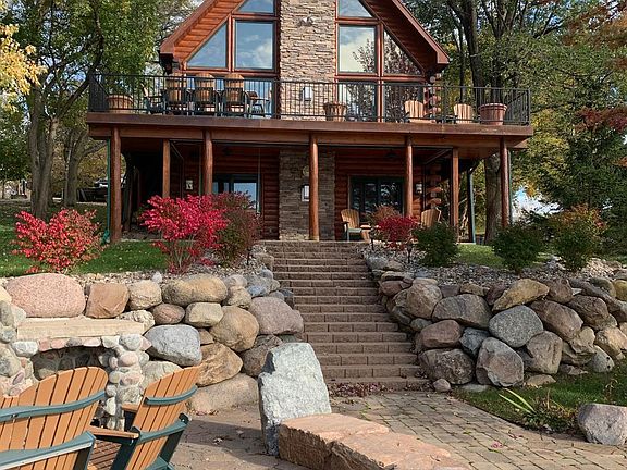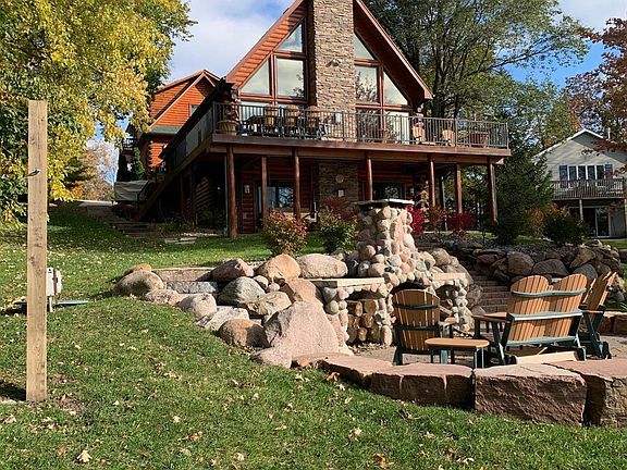 Lakeside living and stunning sunset views, welcome you in this executive lake home. A full pine log sided home with stone accents throughout, as well as, a 1376 Sq. ft. extra sleeping quarters with a wet bar, sauna and attached 24' x 37' garage with an approx. 400 Sq. ft. workshop area, outdoor shower and extra storage for the propane tanks for cooking. The elegant walkway attaches to the main home and features; 4 BR/3BA with a entertainers delight kitchen and a hidden butlers style kitchen, granite countertops in main kitchen, stainless steel appliances, high end Alder cabinetry, a stone gas fireplace spans the entire main floor in the living room with wood shutters, a spacious dining area and is a fabulous centerpiece in the home. The master suite includes a reading nook/lounge area, & an en-suite with 2 sinks. The lower level walkout includes a gas fireplace in the family room, 2 more bedrooms, bathroom and utility room.Outside boasts the same quality features as inside, with a ve