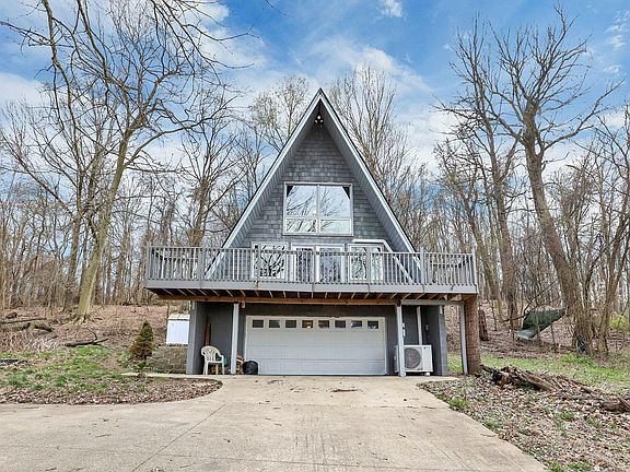 This A-frame is more than a home for those seeking uniqueness, peace, and the opportunity to share their own slice of paradise. Nestled w/in 2 wooded acres, and offering breathtaking views this idyllic getaway is designed to harmonize rustic charm with an open floor plan. The heart of the house is the great room w/ stone fireplace and floor-to-ceiling windows paired with a glass door that leads to the expansive front deck. The owner's suite loft is your secluded haven complete with an indoor balcony and half bath. Recent updates includes a new roof in 2020, freshly painted exterior/interior and brand new heat pump and A/C system 2024. Positioned near the Charles Mill Lake, this property isn't just a home; it's an opportunity, as its unique charm and secluded feel make it an ideal candidate for an Airbnb investment, offering a unique vacation experience.