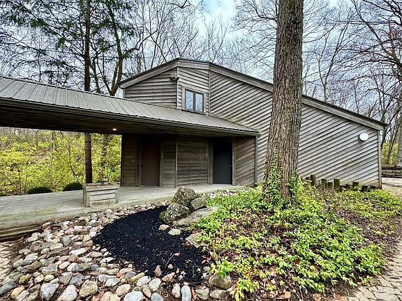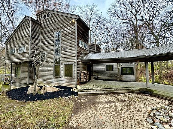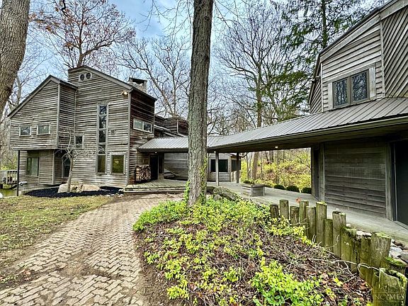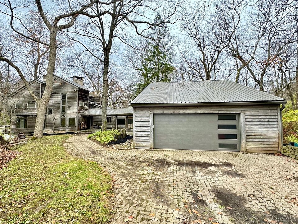 This home is truly one of a kind! A nearly 5,700 square foot contemporary masterpiece of engineering & design set on a 5 acre heavily wooded lot in Oregonia, Wayne Township, Ohio. First floor features soaring ceilings, open floorplan, abundant windows & skylights and is anchored by a massive natural stone wood-burning fireplace. The second floor has an extra large primary suite & huge full bath, laundry room + a staircase that leads to the roof top overlook. The finished basement has multiple walkouts, bedroom, full bath, family room & rec room and a wood stove that could heat the whole house. There is an oversized garage with a separate guest suite w/ full bath & living area + greenhouse. Lifetime metal roof, (2) newer Carrier Geothermal systems. This home needs cosmetic work & personalization w/ huge upside potential!