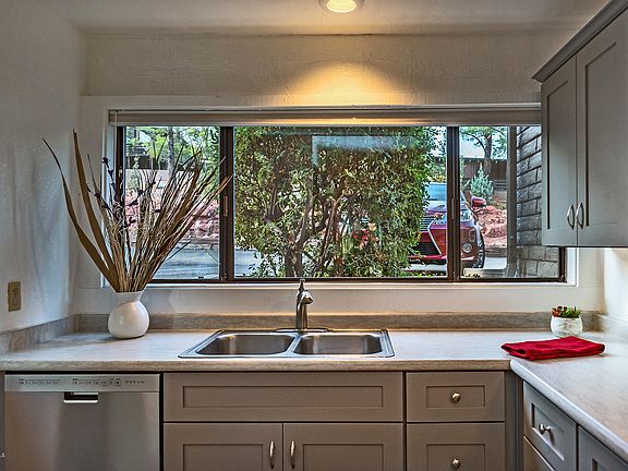 Maintenance free lifestyle in picturesque Sedona Gardens. Red rock views from fenced patio and deck off owner's bedroom. Gorgeous updated kitchen with laminate counters that you will think are granite and modern grey tile floors. Perfect West Sedona location for all Sedona offers at a price you can afford! HOA fee covers: all common area yard maintenance and watering landscape and trash disposal. Also covers exterior building maintenance.