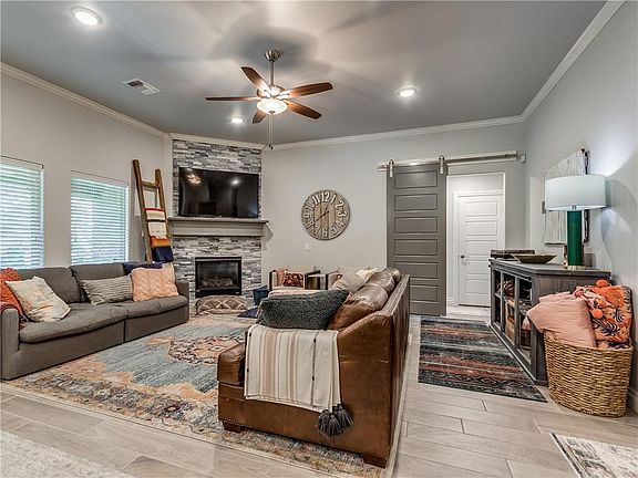Welcome home! 4 bed, 2 and 1/2 bath, 3 car garage! Beautiful wood tile flooring throughout the main areas. Kitchen features custom floor to ceiling cabinetry, quartz countertops, double ovens, stainless steel farm sink, built in wine rack, under cabinet led lighting as well as led upper cabinet lighting & large island great for entertaining! Master bathroom with walk in shower, jetted soaker tub, walk in closet with built in shelves, upper and lower hanging. Master closet also offers convenient access to the laundry room. Secondary bedrooms are located on the opposite side of the master. Front room can be used as a fourth bedroom or an office space. Tankless hot water, 6-8 person storm shelter, sprinkler system & security system. Extended back patio with fireplace, gas hook up and power for TV. This home also backs to a 17 acre farm property, so plenty of privacy while enjoying your back patio! Large side yard with plenty of room for activities! Don't miss out on this beautiful home!