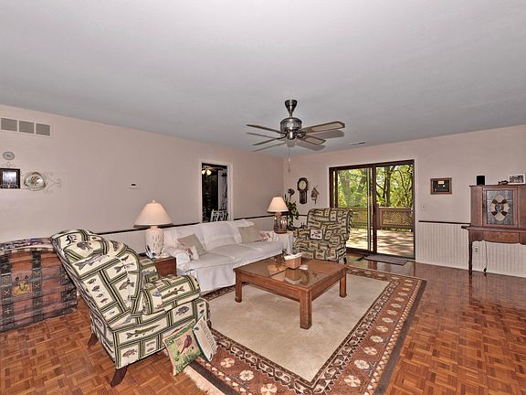 Beautiful Wildwood Ranch 4 bed, 2 bath home on 4+ acres with 2 car attached garage, fenced pasture area + addl storage garage. Private lot, backing to woods with a gazebo. Enter home through courtyard garden & covered porch to entry foyer. Beautiful parquet flooring w open floor plan. home features crown molding, build in shelves, floor to ceiling windows & a stone fireplace with a wood burning stove insert (addl heat source). Kitchen boast Cambria Quartz counters & stainless KitchenAid appliances, breakfast bar & lg Pantry. Breakfast rm enjoys outdoor views through wall of floor to ceiling windows! With over 2000 sf of finished living area + additionally a full, walk out basement w french doors to back patio. Addl amenities include dry walled 2 car side entry garage, ML laundry, storage shed, AAA rated Rockwood Schools. This home offers the best of country living, w shopping, dining & access to I-44 & Hwy 100 in just minutes. Deck floor and handrails replaced 2017.