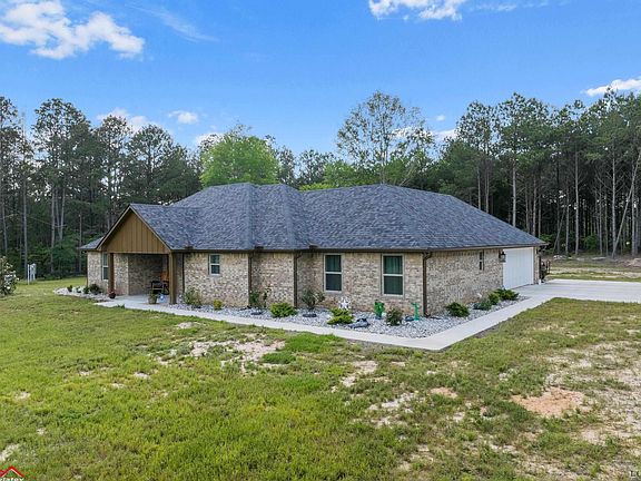 Beautiful custom built home nestled in the East Texas countryside on 7.99 acres with deer and other wildlife for your enjoyment. Savor your morning coffee or a cup of tea in the afternoon on the front or back porch, which are the perfect places to relax and take in the beautiful country scenery. This home offers 2 Br//2 Bath, formal dining opened to the family room with vaulted ceiling, primary bedroom separate from other bedroom with walk in closet. Spectacular kitchen with granite counter tops, plenty of of cabinetry and workspace. Nice sized laundry room just off the main living area! The builder designed the spacious 2 car garage so it could easily be converted into two more bedrooms and a bath. Garage walls and ceiling are fully insulated, with electricity. Large concrete slab outside of the current garage is ready to extend the roofline for an attached garage or could install a detached carport. This home features energy efficient windows, ceiling fans and spray foam insulation. Propane tank has been installed to feed the home generator. There is an RV hookup around the back of the home as well. Located halfway between Marshall and Jefferson with easy access to I-20 or Highway 80. Just minutes away from an assortment of local restaurants, cafes, shops, and Lake O The Pines. You don't want to miss your chance to see this home before it's gone! Call for a showing.