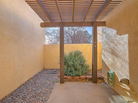 Adorable one owner home with southwest accents is now available in The Esplanade, a picturesque 55+ community. New TPO roof just installed! No steps in home for peace of mind. Enjoy cozy evenings next to the gas FP in the living room with raised ceiling and crown molding. Pella sliding wood door leads to the pergola covered patio for cookouts, relaxation, and visiting with friends. Kitchen features solid surface countertops, SS appliances, and ample storage. Primary BR features two closets, sit-down vanity, and a private patio. The guest BR also has a private patio. Prime location next to the walking path, you will be inspired to explore this desirable enclave. Convenient location in the heart of Rio Rancho near dining, entertainment, and a quick commute to Albuquerque!