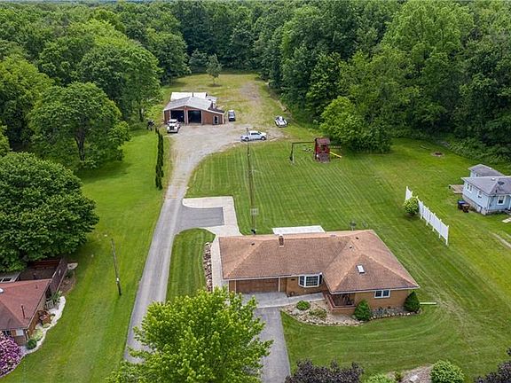 Beautiful brick ranch on almost 3 acres. This 3 bedroom 2.5 bath home is a must see. Many updates throughout such as newer kitchen, Brand new garage door and poured concrete floor, hardwood floors, finished basement with rooms that could be used as additional bedrooms or office space. The garage is HUGE. The heated 40x70 building can fit multiple semis (semi grade floor), tractor equipment, has its own office space, LED lighting, a 5 ton 30 foot monorail Crane, 5hp compressors, bathroom, and even a storage shed off the back. Plenty of gravel space outside to park project cars, semis, etc.