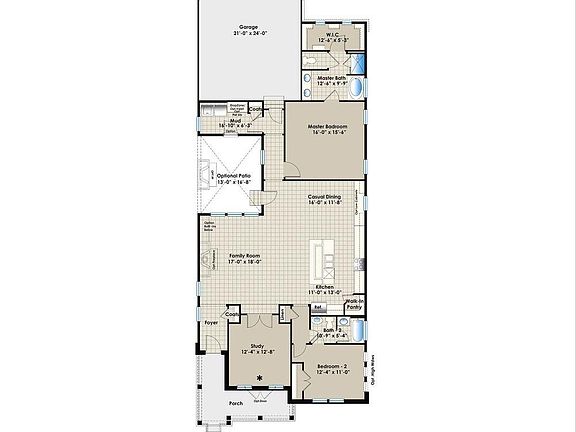 If you love open ranch floorplans, then the Riley by H&H Homes will definitely peak your interest. This 2 bedroom, 2 bath, 2,010 sqft. home can be built with an optional 3rd bedroom by converting the study. The Riley features a kitchen perfect for entertaining, with a large eat-at-island, tons of cabinets, a walk in pantry and a casual dining area that all opens into the family room. Move outside into the courtyard, where it is an extension of your living space. An option is available for it to be covered. The master suite includes a tray ceiling and a bathroom with double vanities, a separate shower and garden tub and massive walk in closet. Off the garage is a huge mud room with laundry, an optional valet and a coat closet.