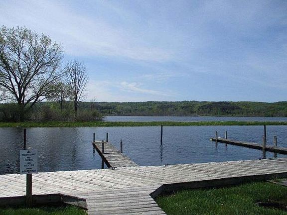 WATERFRONT LIVING with your private 30' boat dock/slip right in front of your home to channel out to Lake Michigan or Arcadia Lake to swim, fish or cruise! Premium corner location with unobstructed water view. Island directly in front of you to enjoy wildlife. Numerous updates include: SS appliances, central air, gas fireplace, laminate floors, retractable awning, Bathworks showers, blinds. This is a ''must see'' home! Amenities include: u/g sprinklers, lawn mowing, clubhouse w/kitchen, mtg room, exercise room, tennis/pickleball courts, fish cleaning gazebo. Most furnishings stay. Don't hesitate to schedule a tour of this unique and rare opportunity to enjoy lake living in quaint Arcadia. 5 minutes to beach, park, boardwalk. NOTE: Newer deck rails to be painted when weather allows.