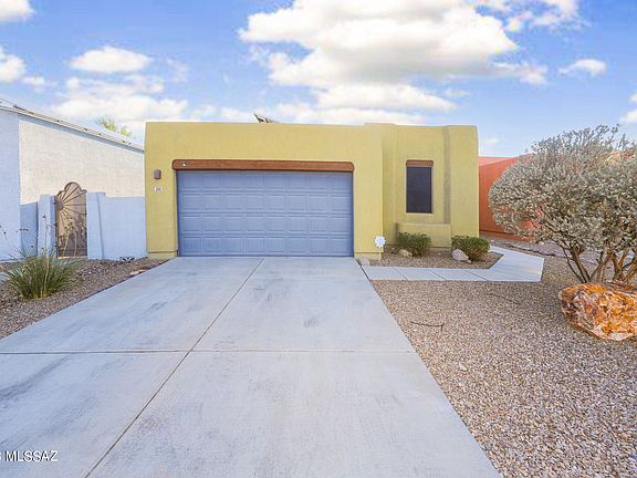 100% Solar (OWNED) great savings!!! T.J. Bednar-built. A light & open plan, w/high ceilings. Nothing at all for you to do, turn-key. Roof recoated. Newly-painted. A/C & water heater replaced in 2021. Open plan w/Dining area & bar. French-door fridge, micro, & new convection range w/air fryer built-in. Main bedrm w/ensuite & walk-in closet. 2nd bedrm at other end of home w/bathrm close-by. Private, high-walled yard w/plenty or room for gardening or kid toys, no neighbors behind. Covered patio w/extended pavers. Perfect home for singles, roommates, first family home, & down-sizers. Quiet street, leading to beautiful Lakeside Park. Plenty of shopping nearby, public transport, The Rillito Loop, & 3 major parks (one w/community pool). Mins fm. D-M base, just 14 mins to TMC Hosp & Park Place Mall, 20 mins to airport. Easy home to maintain, come home to relax.