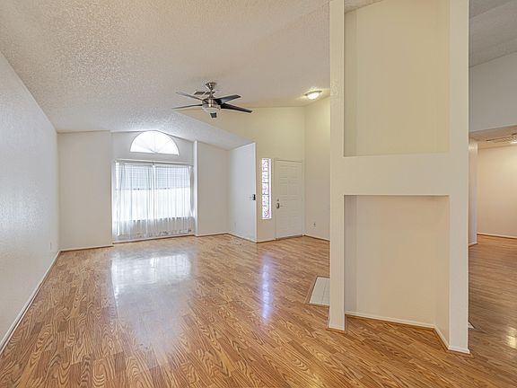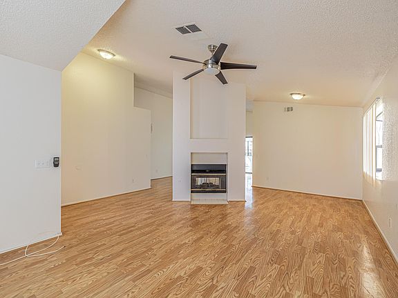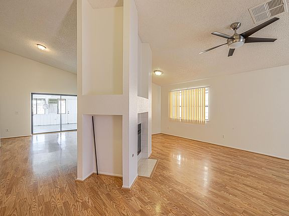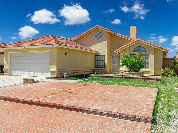 West Rosamond location, this single story home has upgrades. There is wood type flooring throughout the interior. Large ceramic tile in kitchen and bathrooms. The living room has vaulted ceilings and a double sided fireplace. The kitchen has tile countertops, white colored appliances and white painted cabinets. There are window blinds and verticals, brushed nickle lighting fixtures and hardware. Both bathrooms are upgrade with ceramic tile, double sink cabinet in the primary bathroom. There is a permitted enclosed patio that just needs some flooring. There is raw desert land behind the residence (No neighbors).
