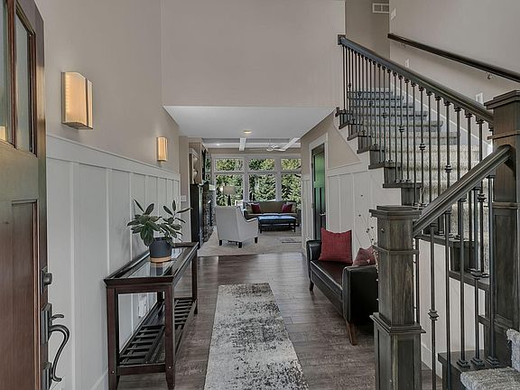 This gorgeous two-story patio home shows like a model home! It sits on a manicured lot in the beautiful Quarry Woods neighborhood with a wooded preserve with walking trails behind it, offering privacy and scenic views and quick access to HWY 15 and I94. Designed with quality throughout, it features a welcoming front porch, a heated 4-stall garage with rear overhead door, a screened porch and an exposed aggregate patio (both with speakers) and meticulously landscaped grounds. Inside, the living room impresses with soaring ceilings, painted beams, huge windows, and a gas fireplace, while the gourmet kitchen boasts painted cabinets, a dark-stained center island, granite tops, tile backsplash, and accent lighting. The dining area is surrounded by windows on three sides and opens to both rear outdoor spaces, perfect for entertaining. The main-level primary suite includes transom windows, decorative wall accents, a lighted tray ceiling, and a spa quality bath with walk-in tile shower, freestanding tub, dual vanities, and separate water closet. The walk in closet has a laundry area, also featuring granite tops. The upper level offers two bedrooms, a loft, a versatile den/exercise/rec room, and a bonus 16x10 storage area with nearly 6 ft of ceiling height!