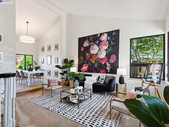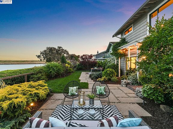 3341 Washington Court offers bayside living in Alameda’s Waterford Cove where the San Francisco Bay feels like an extension of your home. Situated by the water, this beautifully upgraded 5BD/3BA has picture windows throughout its 2619 SF, framing Bay views and brightening your day. Step into a grand entry with a formal staircase to the upstairs bedrooms and a sprawling upper floor recreation room. On the main floor, the great room and separate dining room with cathedral ceilings share a stunning view. An updated eat-in kitchen has an adjacent family room, fireplace, and gorgeous parquet wood floors. Indoor/outdoor living is right outside: a magical garden with rare, mature plantings, handmade bench seating, patio areas for dining/lounging, and grass for pets and play. The 1st floor also has a full bath, office/guest room, & laundry room. Upstairs, the primary suite has a giant picture window, large split bathroom, and walk-in closet. Another full bath is upstairs, plus second great room with a fireplace could be a home office or 5th bedroom. A 2-car garage with storage and large driveway are out front. Walk to the Bay Trail, yacht club, beach, shopping, and top-ranked schools. Close to the ferry/transbay bus and Oakland Airport–and when you’re home, you’re right on the water!