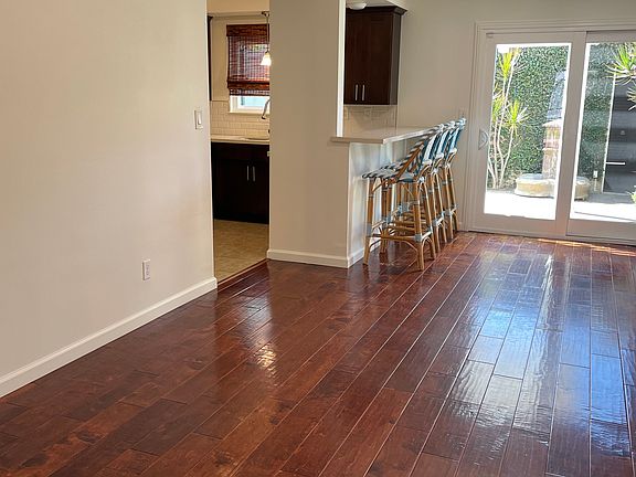 Beautifully remodeled Rossmoor Townhome tucked away towards the back of the complex with views of the green belt and pool. Freshly remodeled from top to bottom with newer hardwood floors on the first floor and new fresh carpet on the second floor and staircase. Kitchen includes quartz counters with cherry wood cabinets and stainless steel appliances, tile floors and backsplash. LG refrigerator and front loading washer/dryer units included. This is the largest Rossmoor Townhome Model with 4 bedrooms and 2 remodeled bathrooms. New dual paned windows and sliders installed in 2020, heating system as well as custom built in media unit with TV wall mount are just some of the many upgrades in this impeccably kept home. Coveted 2 car attached garage with automatic garage door openers makes coming and going a breeze. One permitted parking spot in addition to 2 car garage is included. Fully remodeled secluded patio area with beautiful paving stones, built in seating wall, fountain and fire pit. Gardener is included. Two pools, one jacuzzi and tranquil green belt common areas make this community enjoyable year round outdoors. A primarily owner occupied corner of the community, this home is turn key and ready to be enjoyed! Small pets will be considered. Owner pays for gardener and HOA feels. Tenant pays all other Utilities.