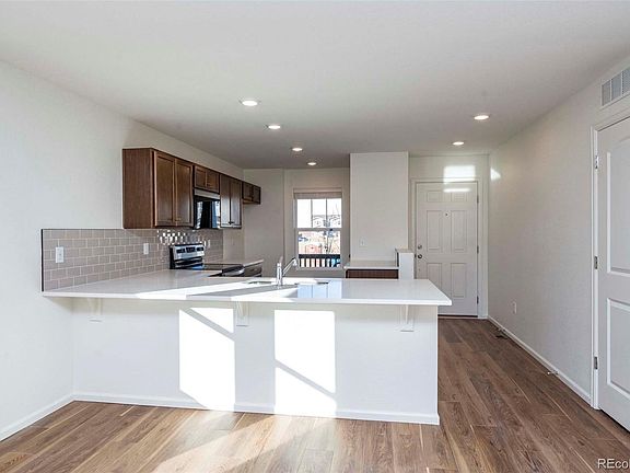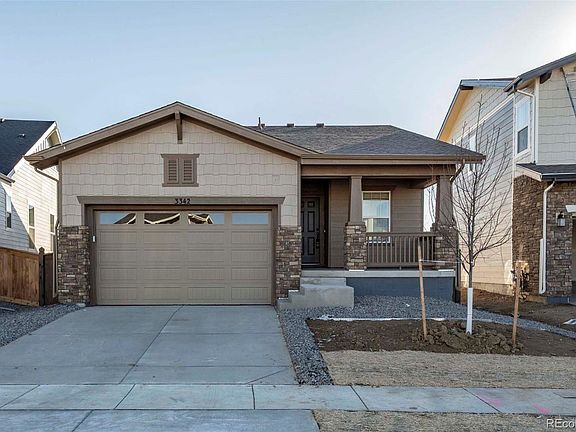 Welcome to your dream home! This Craftsman-style residence seamlessly blends classic charm with modern luxury, boasting three bedrooms and two bathrooms. Step onto the welcoming front porch, inviting you to relax and soak in the neighborhood ambiance. Inside, discover the perfect marriage of functionality and elegance with luxury vinyl plank flooring throughout, complemented by quartz countertops in the kitchen. The warmth of truffle-stained hardwood cabinets flows seamlessly through each room, adding sophistication to the living space. The home features a spacious living area filled with abundant natural light, creating an inviting atmosphere for family and guests. The open-concept kitchen and dining area make entertaining a delight, while the master bedroom comes complete with a large walk-in closet and an ensuite bathroom for added privacy. Modern fixtures and finishes elevate the home's aesthetic. Conveniently located near the Villages at Prairie Center shopping center, you'll have easy access to a variety of retail options. With proximity to I-76, commuting to Denver is a breeze, making this home ideal for those seeking a harmonious balance of suburban tranquility and urban convenience. Don't miss the opportunity to make this Craftsman-style house your home! Contact us today to schedule a viewing. The Listing Team represents builder/seller as a Transaction Broker.